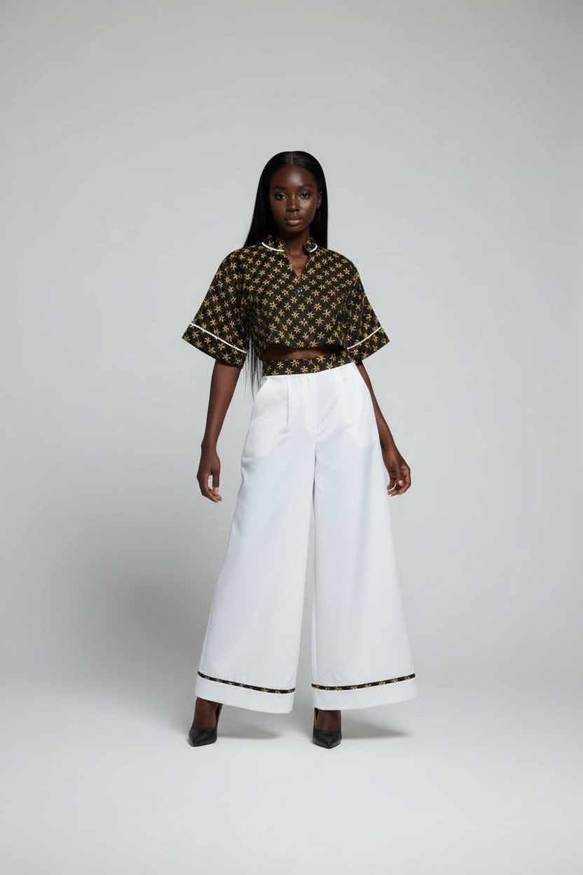 Découvrez nos ensembles uniques qui allient élégance contemporaine et inspirations mahoraises . Conçus pour sublimer toutes les silhouettes, ils se composent d'un pantalon blanc fluide à jambes larges , agrémenté de délicates finitions imprimées rappelant les motifs traditionnels.